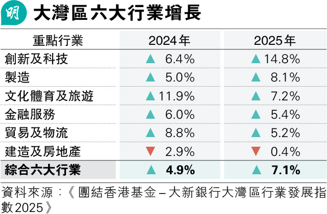 報告訪問逾3400間大灣區企業,分析逾120個指標,指數顯示大灣區綜合6個重點行業按年增長率,由去年4.9%加快至今年7.1%,其中創科業成增長「火車頭」,製造業持續邁向智能化發展至高增長,建造及房地產業跌勢則放緩。香港金融服務業指數為85.6,按年增6.2%,貿易及物流業則為82.5,按年增約7%,文體及旅遊業為79.3,報告特別提到啟德體育園截至9月中旬舉辦逾30場大型活動,文體旅業經濟貢獻按年增13%,連續兩年居首。