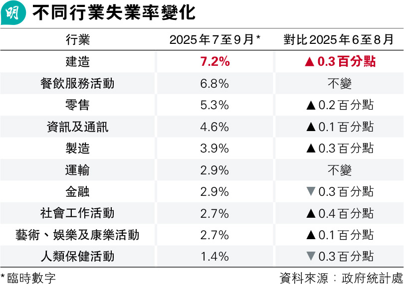 統計處昨公布今年7至9月失業率,由3.7%升至3.9%,主要經濟行業失業率均上升,社會工作活動業及建造業有較明顯升幅。建造業失業率高達7.2%,其中樓房裝飾、修葺及保養失業率為7.9%,兩者較6至8月均升0.3個百分點。餐飲服務活動業失業率維持6.8%。