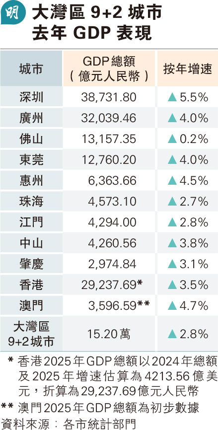 【明報專訊】大灣區城市新年前已先後公布2025年經濟數據,估算去年9+2城市GDP突破15萬億水平,年增2.8%至15.2萬億元(人民幣,下同),躋身全球經濟規模第一梯隊,續追居首的東京灣區。而在內地9市當中,深圳、廣州、佛山和東莞續領先,廣州更因去年商務會展文旅蓬勃,消費市場升溫,GDP增速按年提高1.9個百分點至4%。