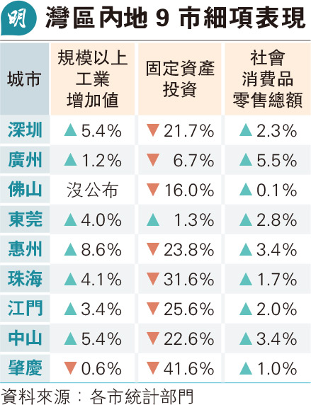 去年GDP增速排第二的惠州,規模以上工業增加值年增8.6%,為灣區第一,先進製造業和高技術製造業增加值有較快增長是主因。另外9市的固定資產投資仍然受樓市續冷影響,表現繼續偏弱。