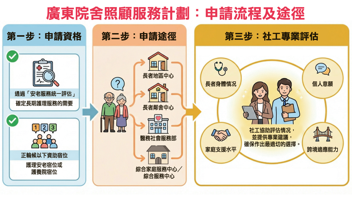 香港政府自2014年推出「廣東院舍照顧服務計劃」,讓符合資格的長者以資助形式入住指定內地院舍。經多年發展,計劃日漸完善,政府亦不斷提升配套,包括: