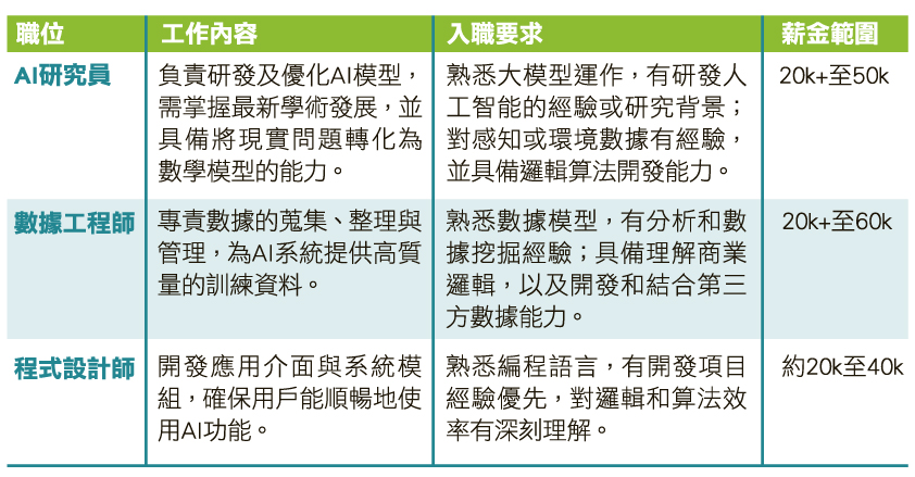 「在香港與大灣區其他城市之間,AI職位的需求存在顯著差異。香港側重於商業應用的職位,例如金融AI工程師,具備相關碩士資歷者月薪約港幣25,000至40,000元。大灣區城市在資源和規模上,更適合進行基礎性的AI研發和基礎設施建設。以深圳為例,當地主要需要技術研發型人才,如深度學習工程師、計算機視覺工程師及AI軟件工程師等。一些大型科技公司如騰訊、華為等會招聘以上職位,具備博士資歷的專業人士年薪可達人民幣70萬元。」