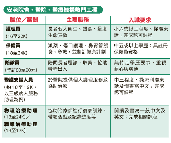 本港護理業向來人才短缺,成為轉職者及年輕人的熱門事業選擇。香港老年學會高級經理(能力發展)陸碧珊指,香港老年學會轄下香港老年學學院開辦多項護理課程,包括「護理員證書」、「保健員證書」、「醫護支援人員證書」及「物理治療助理證書」等,吸引有意入行者入讀,以裝備入行所需技能。課程兼顧理論與實習,內容涵蓋長者護理技巧、健康評估及心理支援,讓學員可即時應用於工作。